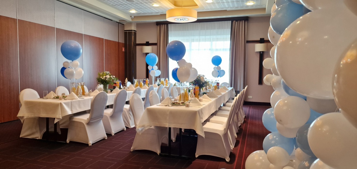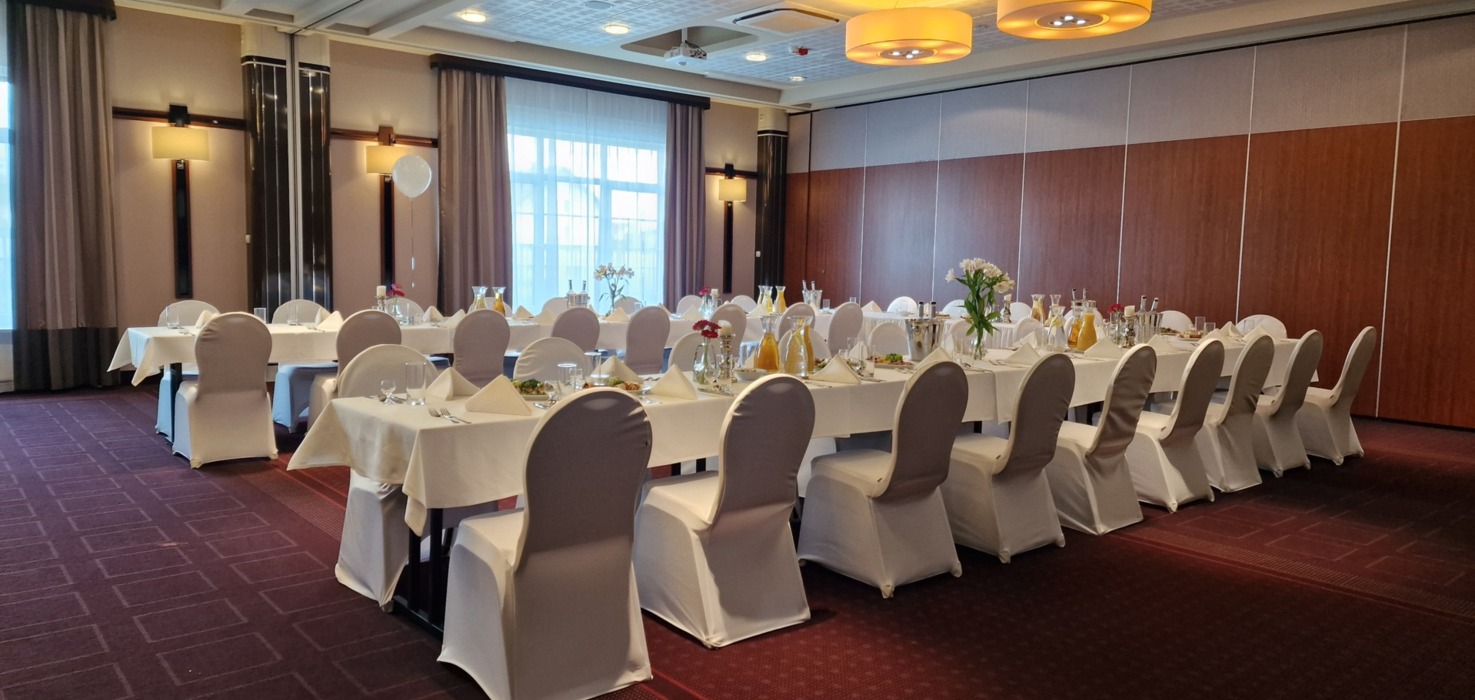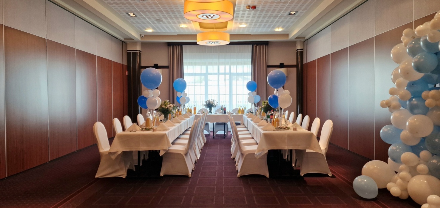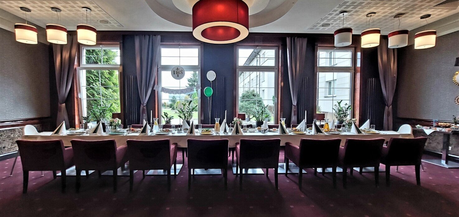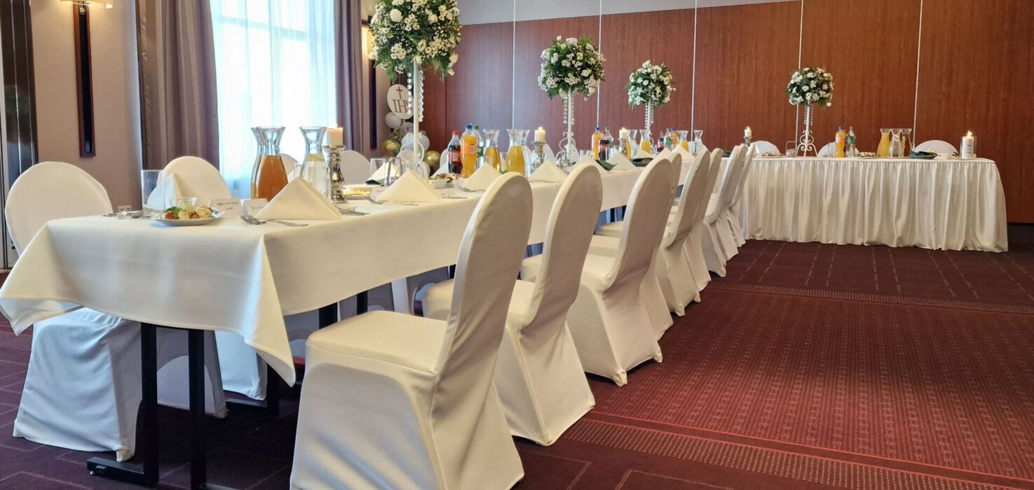 Oferujemy różne ustawienia: okrągłe stoły lub klasyczne „podkowy”. Zapewniamy pełne wyposażenie: obrusy, pokrowce, świece i świeczniki, a także hotelową muzykę w tle.