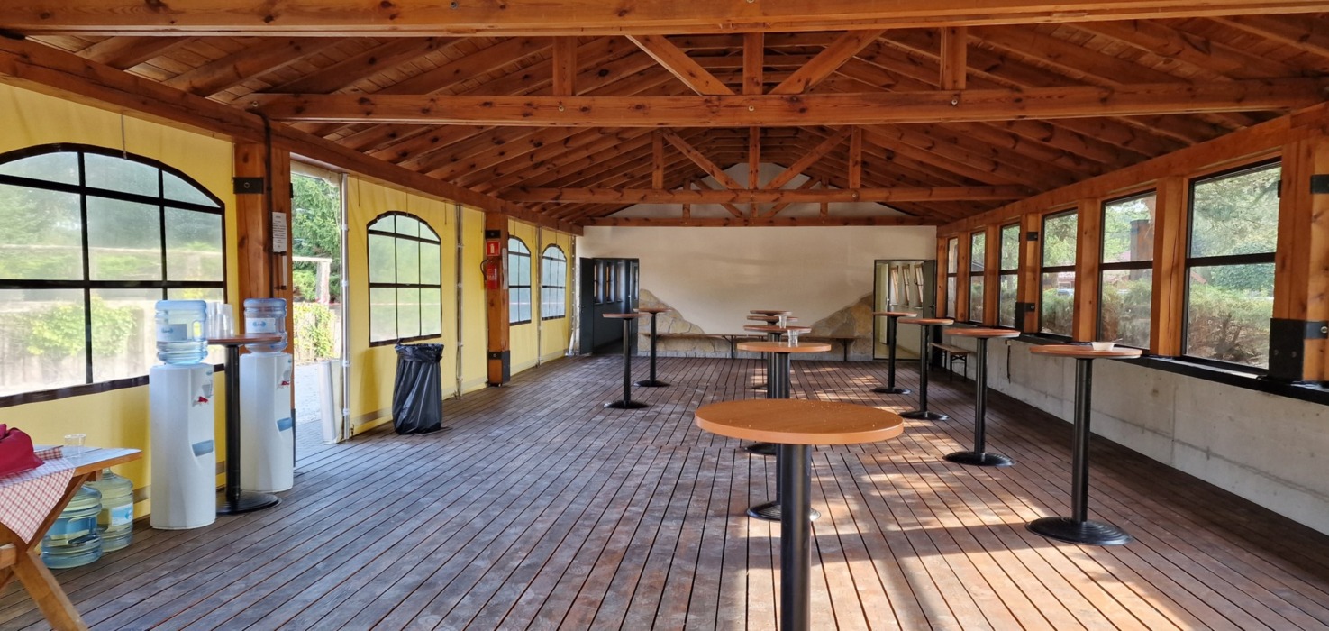 zadaszone wiaty z miejscami do odpoczynku, stacjonarne toalety i prysznice,
